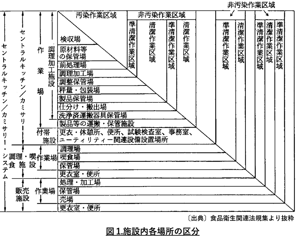 なお,セントラルキッチン/カミサリー・システムの施設内各場所の区分についても規定されていて、これを図⒈ に示した。