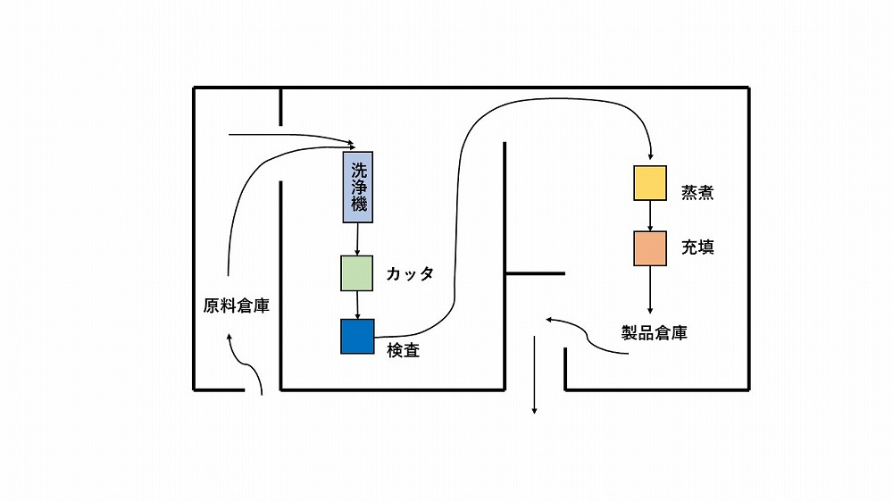 流れ線図は、職場や機械設備の配置を示したレイアウト図に、生産工程における基本的要素からなる工程系列を、1本の実線により結んで流れを記入したもの。