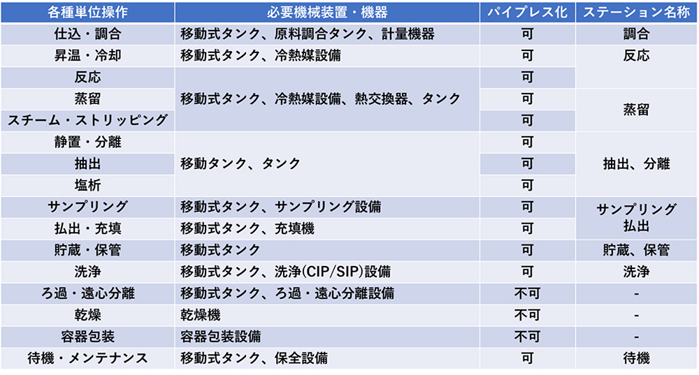 バッチプロセスの運転方式を各単位操作に基づいて、細分化すると、各単位操作として表1.に示すように主な操作としては、調合操作、昇温徐熱操作、反応操作、蒸留操作、ストリッピング操作、静置分離操作、抽出操作、塩析操作、ろ過操作、乾燥操作、容器包装操作などに分類できる。これらの単位操作に必要な機械装置・機器を比較してみると製造製品は各種あるが比較的類似した機械装置・機器で構成されていることが多いことに気が付く。類似の機械装置・機器で実施可能な単位操作⇒操作の機能集約⇒各種ステーション(例えば、原料の受入、払出、貯蔵、洗浄、待機、保管など)とする。