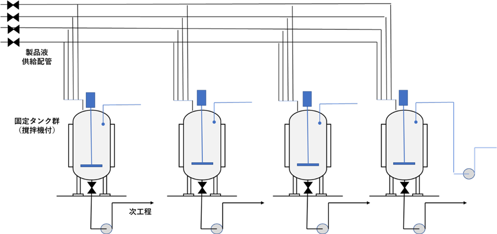 生産する製品数や容量によって、これらのステーション数は追加されたり使用されなかったりするものも発生する。これらのステーションの概念に対して、従来用いられているバッチプロセスでは、あらかじめ想定される配管ライン、機器を設置しておき、製品による配管ライン切り替えの都度ライン改造工事を行い、品種変更に伴うオーダーに対処することが必要になっていた。
