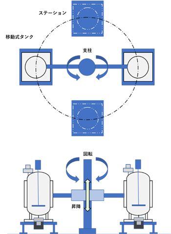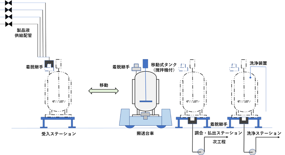 移動式タンクを各ステーションに搬送台車で移動し、移動式タンクを固定する前の停止位置決めはその後に行う開閉弁装置を持った配管接続、移動式タンクに設置された撹拌機駆動用の動力源と制御信号伝送装置の接続、移動式タンクに加熱水や冷却水をタンク外装のジャケットに供給するユーティリティ供給装置の接続を確実に行うための重要な要素技術となる。