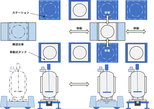また移動する搬送台車と移動式タンクを一体化にするか、搬送台車を共有化して複数の移動式タンクを原則一台(実運用では二台併用が良い)の搬送台車で移送する方式を選択するかは、複数基の移動式タンクごとに一体とした場合、コスト的に負担が大きいばかりでなく、搬送台車の稼働率が低下し効率的な製造実行プラントとはならない。どちらの方式を採用するかは、製造品種の特性や生産条件などに照らし合わせて最良な搬送方式を決定することが重要なポイントになる。