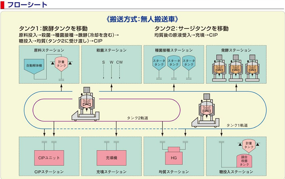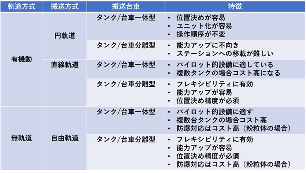 移動式タンクを必要なステーションに移送する方式としては、有軌道の搬送方式を採用するか、無軌道型の搬送方式を導入するかの選択を行う必要がある。単位操作系と全体のフレキシビリティの全体最適化の観点から無軌道型搬送方式に利点が多いと言えるが、移動タンクの容量に伴うサイズ、製造量に伴う移動タンクの数量、製造品種の切り替え頻度などにより有軌道型搬送方式が良い場合もある。