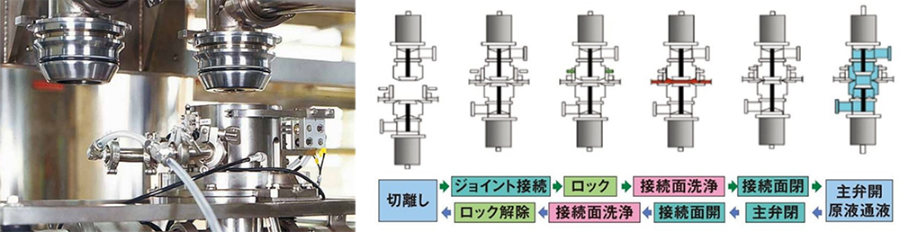 移動式タンクと各ステーションのプロセスラインを接続装置は、飲料・液体食品など殺菌工程前か後かによる衛生管理状態が重要となるため、配管接続装置はパイプレスプロセスの最重要装置に位置付けられる。サニタリ仕様としての清浄度と殺菌が必須となる。着脱・分離した接続装置を確実に接続し要求衛生管理状態に再構築することが製品品質を左右することになるためである。