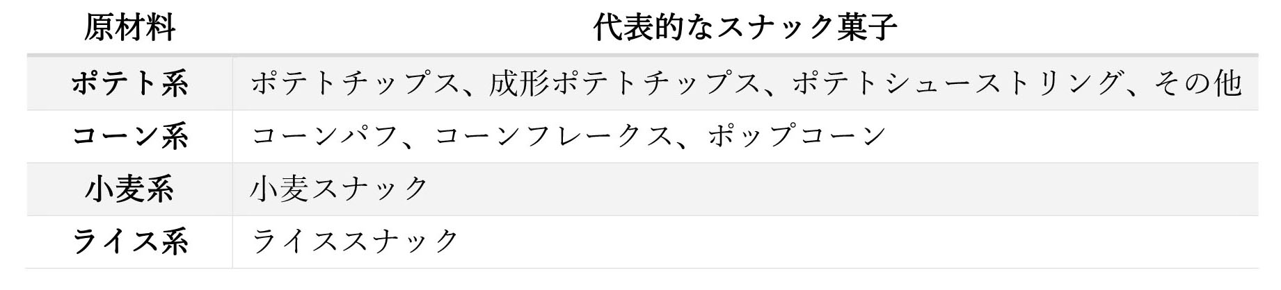スナック菓子は、甘くないあっさりとした風味を持った、子供のおやつから大人の手軽なおつまみとして食べられている。一般消費者向きの嗜好性を持った菓子である。国内ではスナック菓子を原材料別に分類すると表1.のように大別されている。