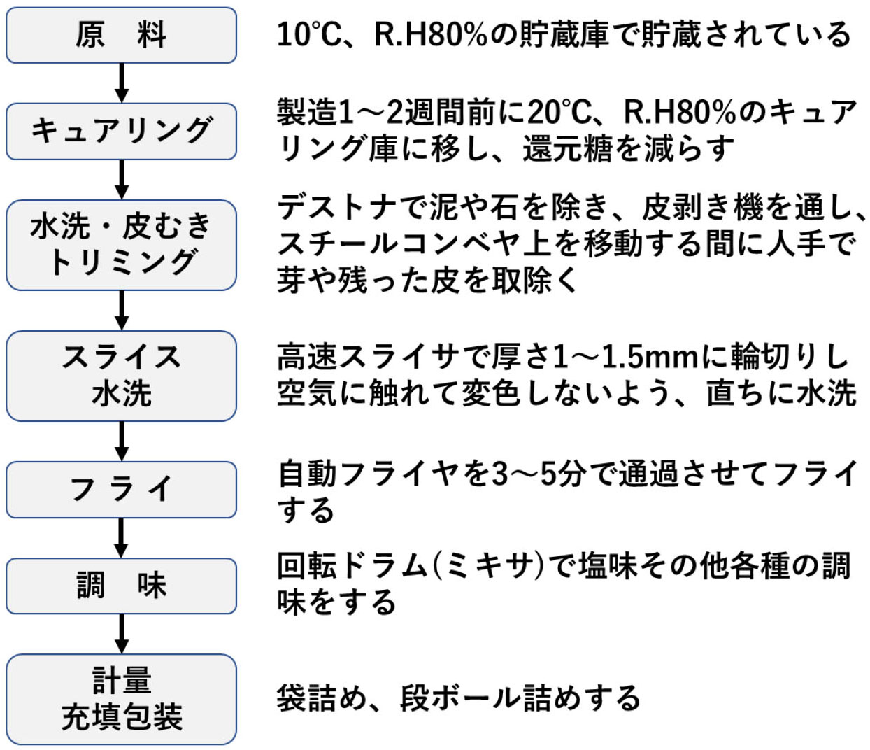 スナック菓子類の代表的な製品で、馬鈴薯を水洗、剥皮後約1.5mmに薄切りし、約180℃のフライ温度で約2分間油揚げし、軽く食塩で味付けした単純な行程で仕上げられる製品である。